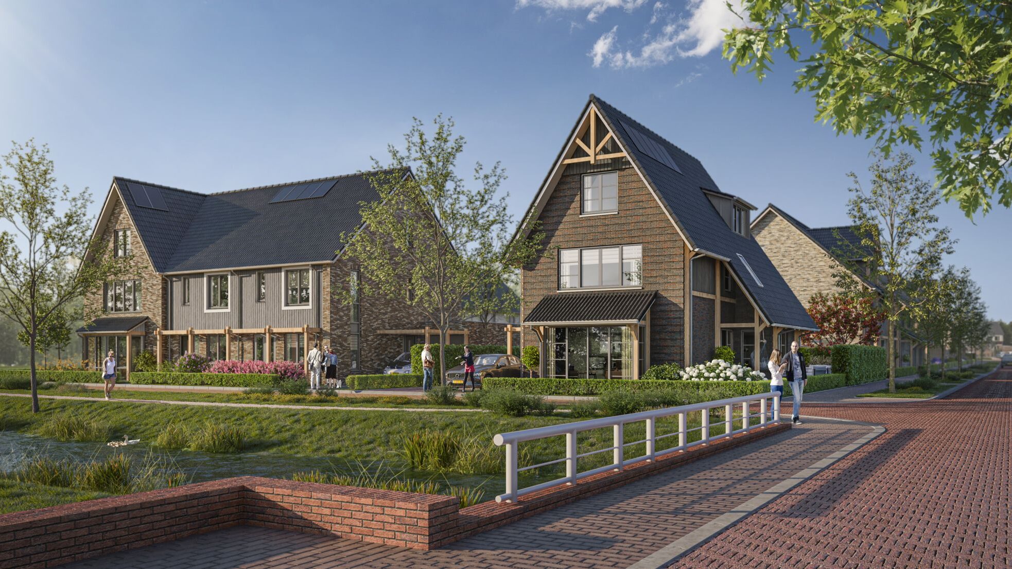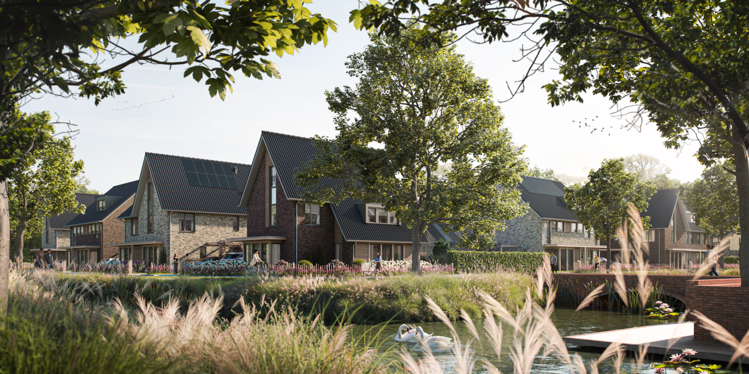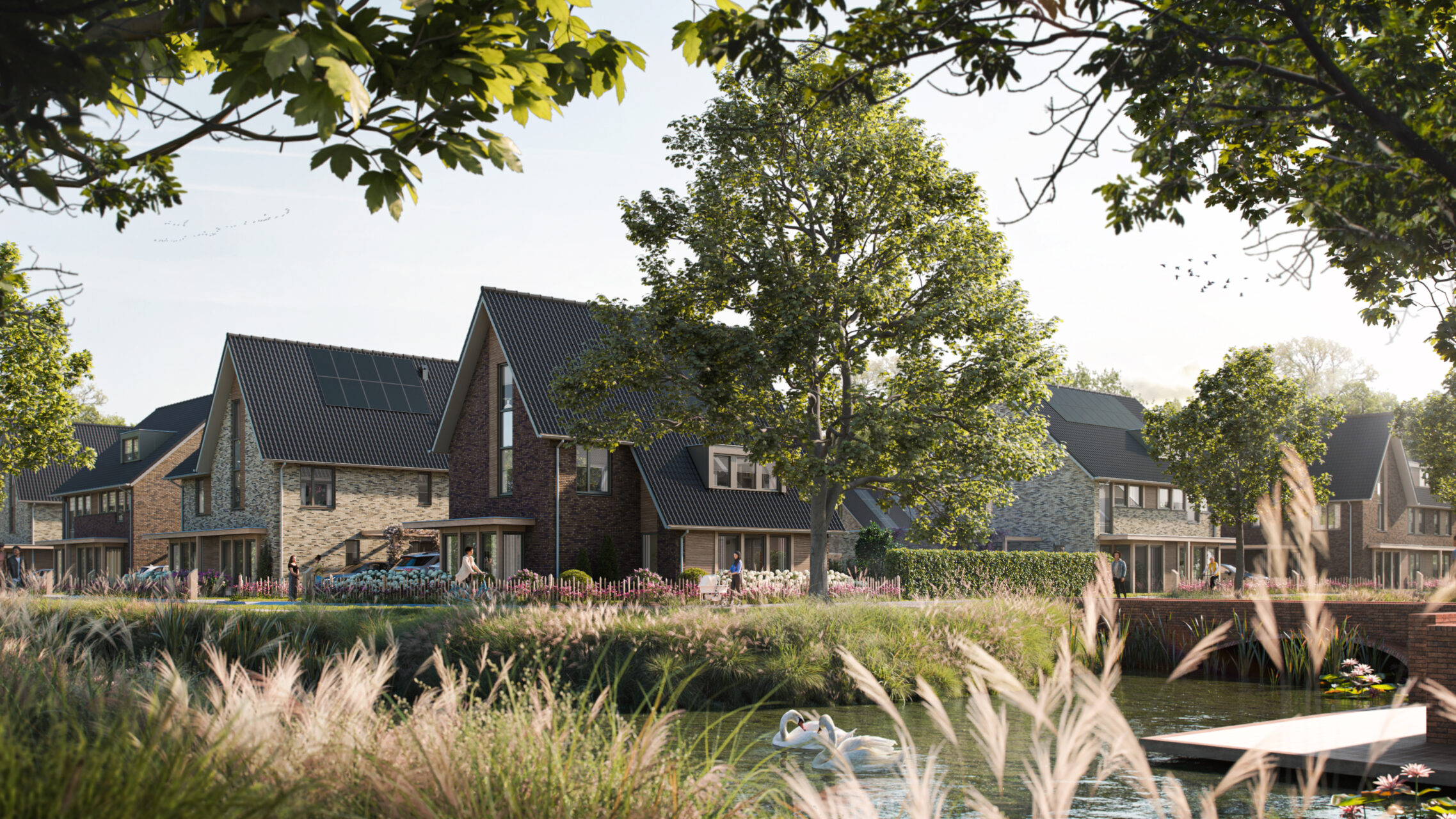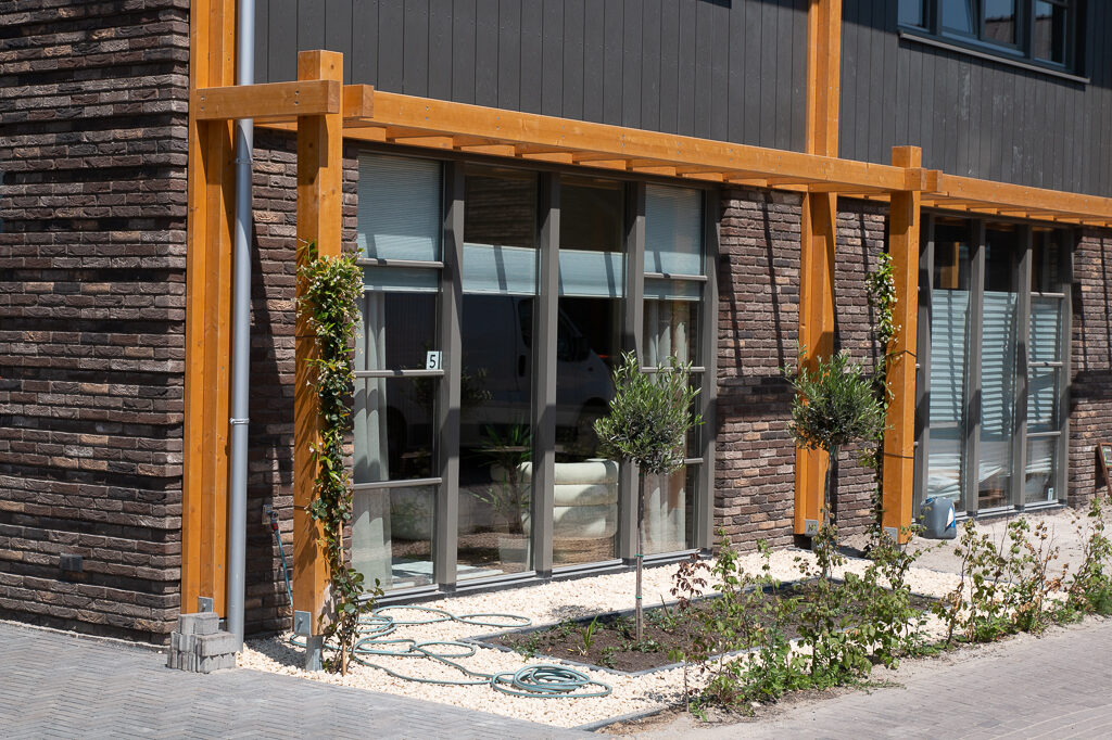 Hoef en Haag is onlosmakelijk verbonden met het rivierenlandschap van de nabijgelegen rivier de Lek. De blauw-groene structuur van water en groen, waarvoor het bestaande agrarische landschap met sloten, wilgenrijen en boerenerven het vertrekpunt vormden, zorgen voor een natuurlijk indeling in drie deelgebieden: Het Dorpshart, Het Lint en De Erven. Elk deelgebied heeft een eigen karakter en is opgebouwd uit kleinschalige buurtjes met bijbehorende ontmoetingsplekken. De woningen zijn onderscheidend vormgegeven, hebben een eigentijdse uitstraling en soms robuuste detaillering. In deelgebied De Erven zie je bijvoorbeeld verbijzonderingen zoals veranda’s, begroeide pergola’s en zitelementen die uiting geven aan het buitenleven.