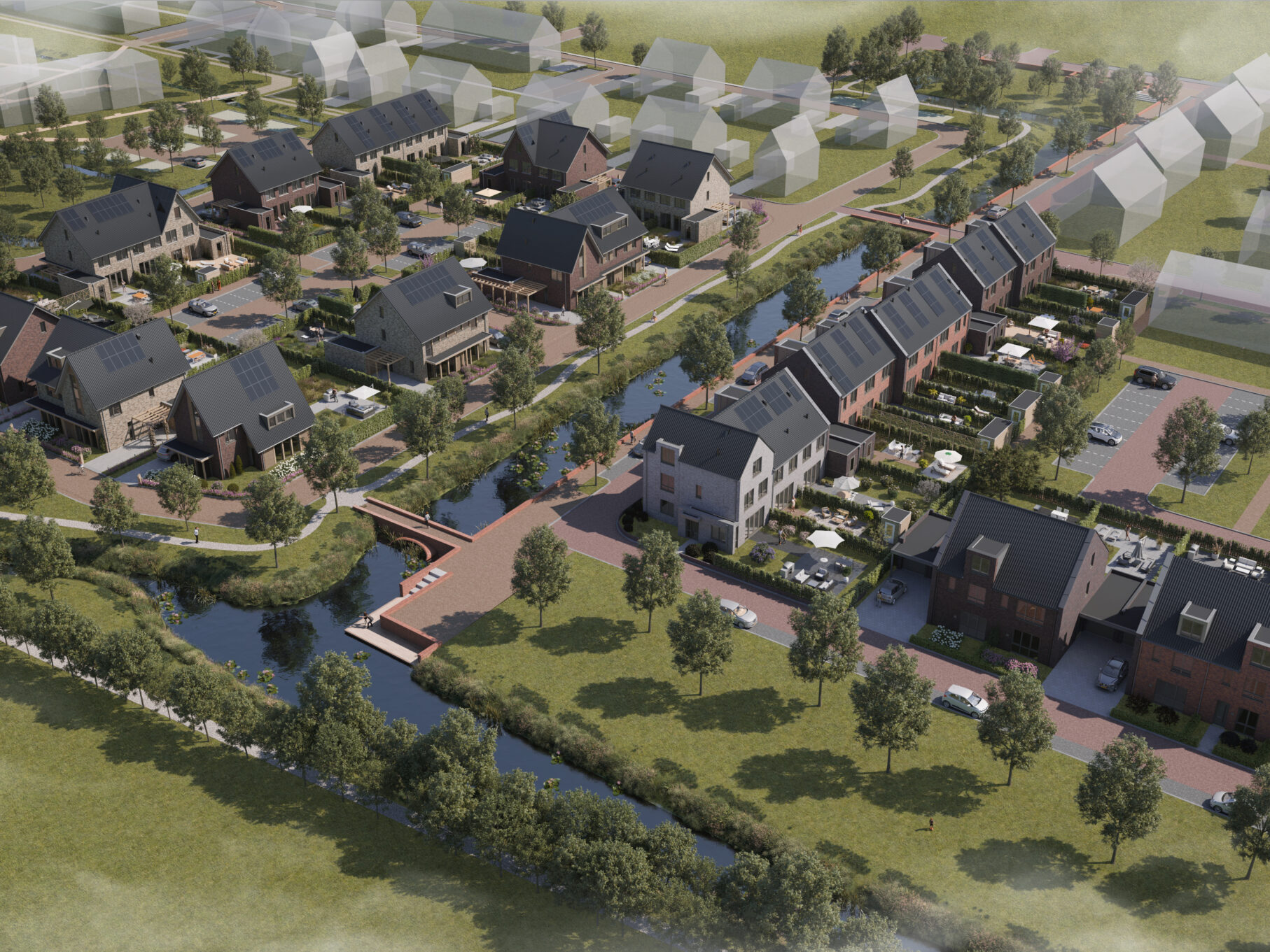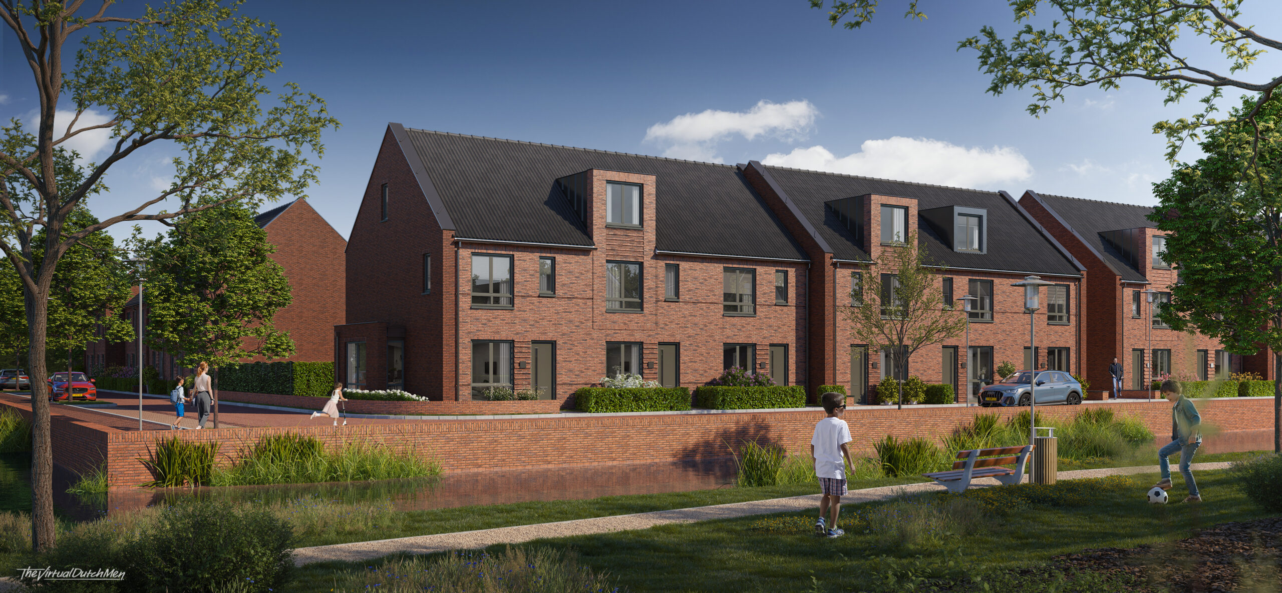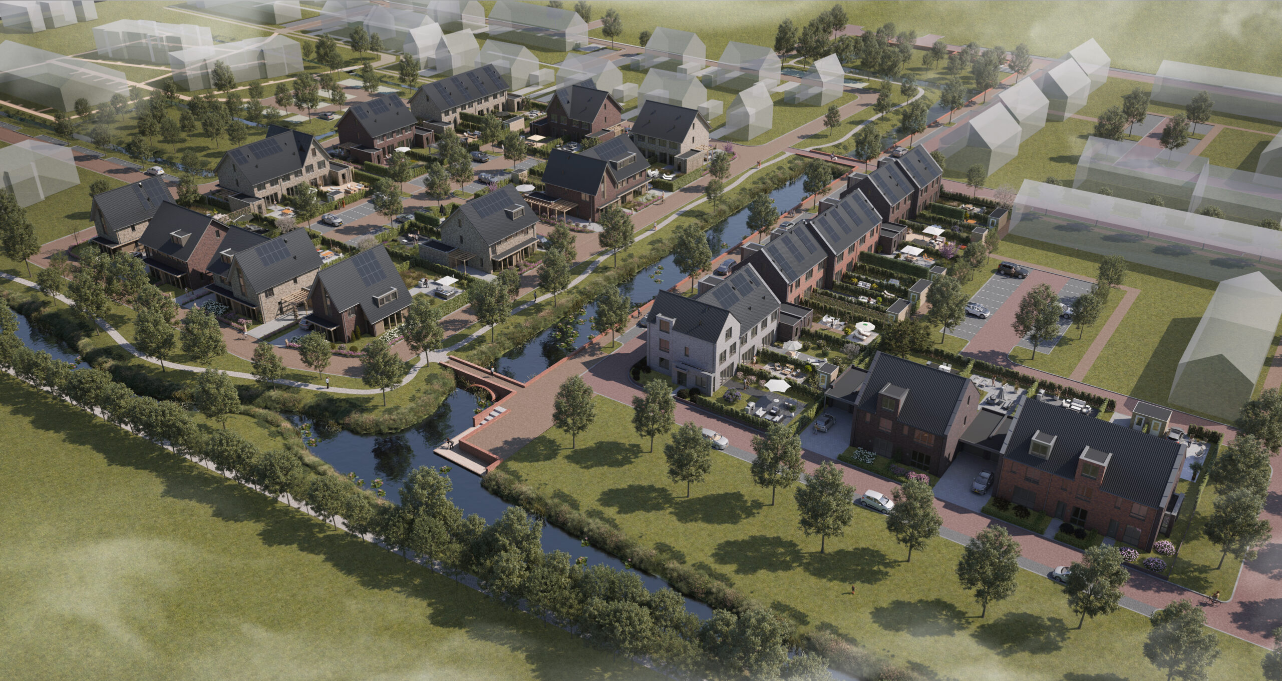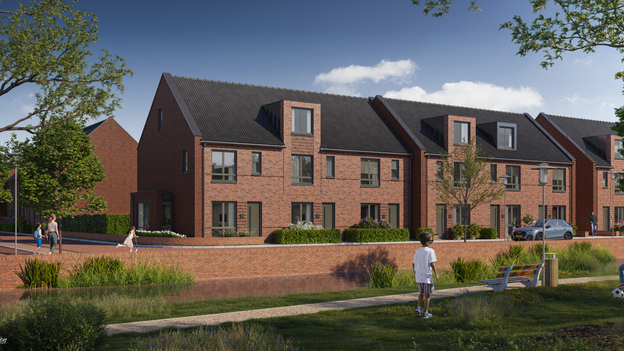 Hoef en Haag is onlosmakelijk verbonden met het rivierenlandschap van de nabijgelegen rivier de Lek. De blauw-groene structuur van water en groen, waarvoor het bestaande agrarische landschap met sloten, wilgenrijen en boerenerven het vertrekpunt vormden, zorgen voor een natuurlijk indeling in drie deelgebieden: Het Dorpshart, Het Lint en De Erven. Elk deelgebied heeft een eigen karakter en is opgebouwd uit kleinschalige buurtjes met bijbehorende ontmoetingsplekken. De woningen zijn onderscheidend vormgegeven, hebben een eigentijdse uitstraling en soms robuuste detaillering. In deelgebied De Erven zie je bijvoorbeeld verbijzonderingen zoals veranda’s, begroeide pergola’s en zitelementen die uiting geven aan het buitenleven.